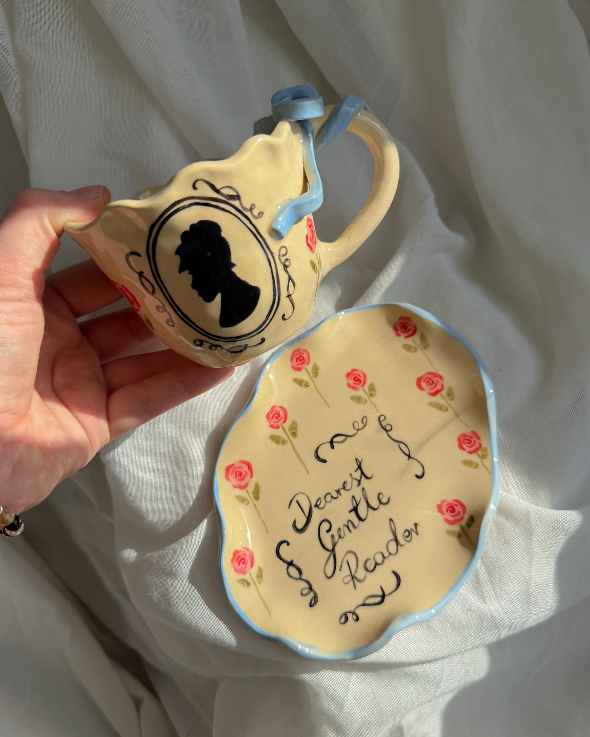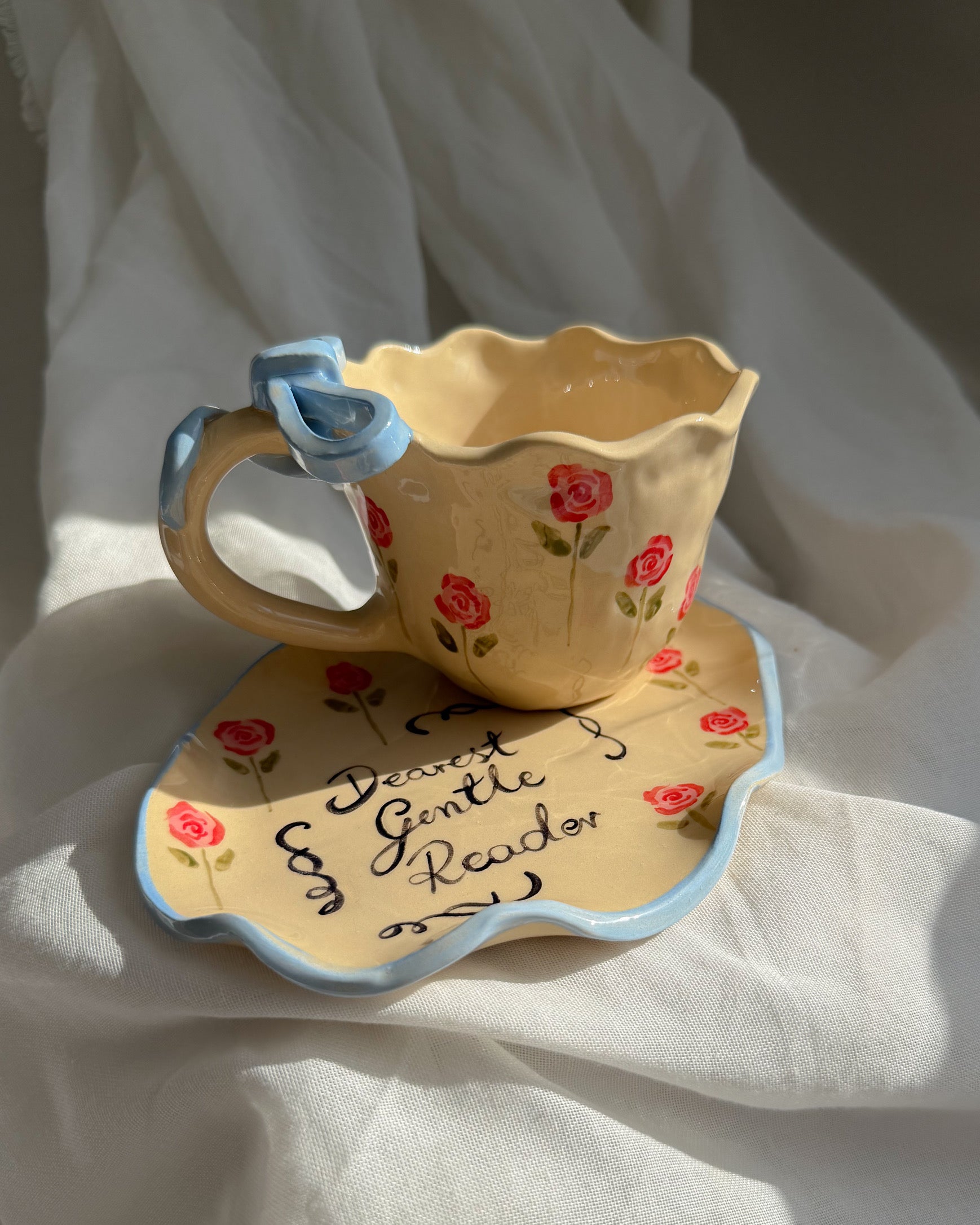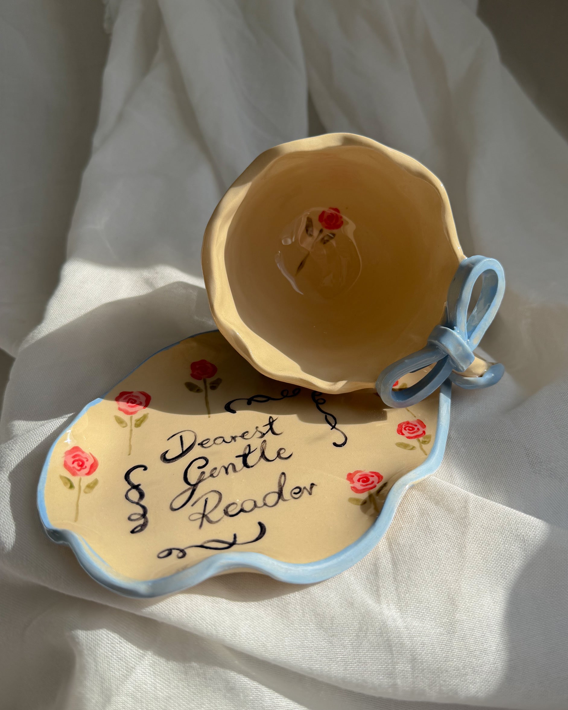 Ceramic cup with oval plate, red roses with baby blue ribbon. Bridgerton theme.