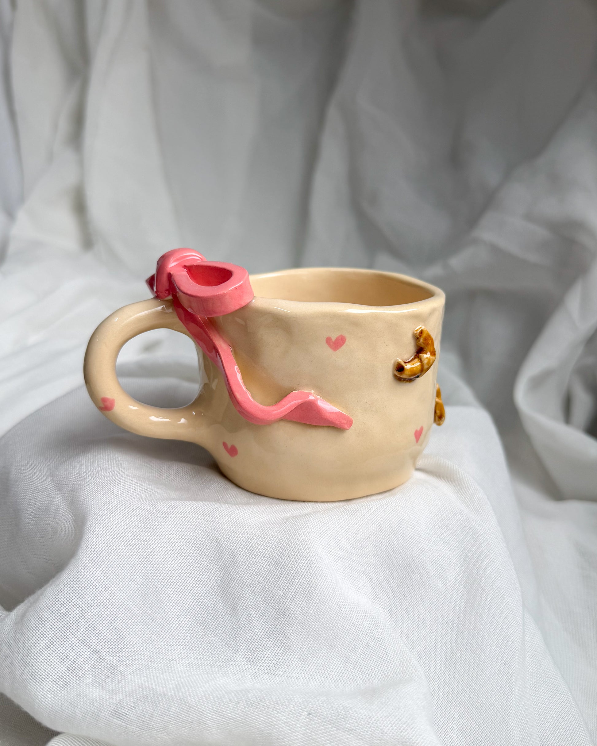 Handmade ceramic mug with pink ribbon, hearts and croissant. Each mug is handmade, there may be slight differences or imperfections between the same models of mugs.