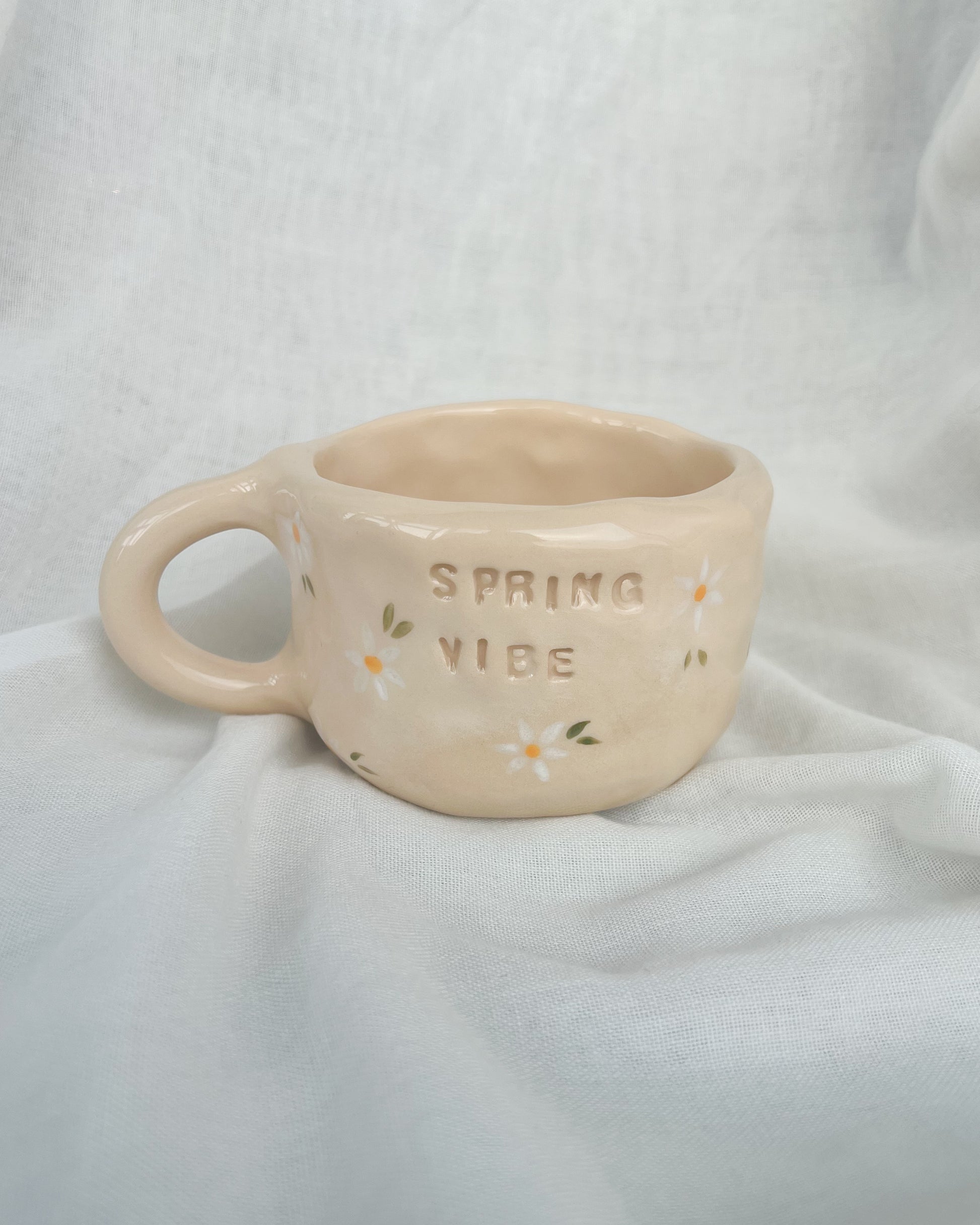 Handmade ceramic mug with white daisy pattern, the sentence "spring vibe". Each mug is unique, so there may be slight differences or imperfections between the same models of mugs.