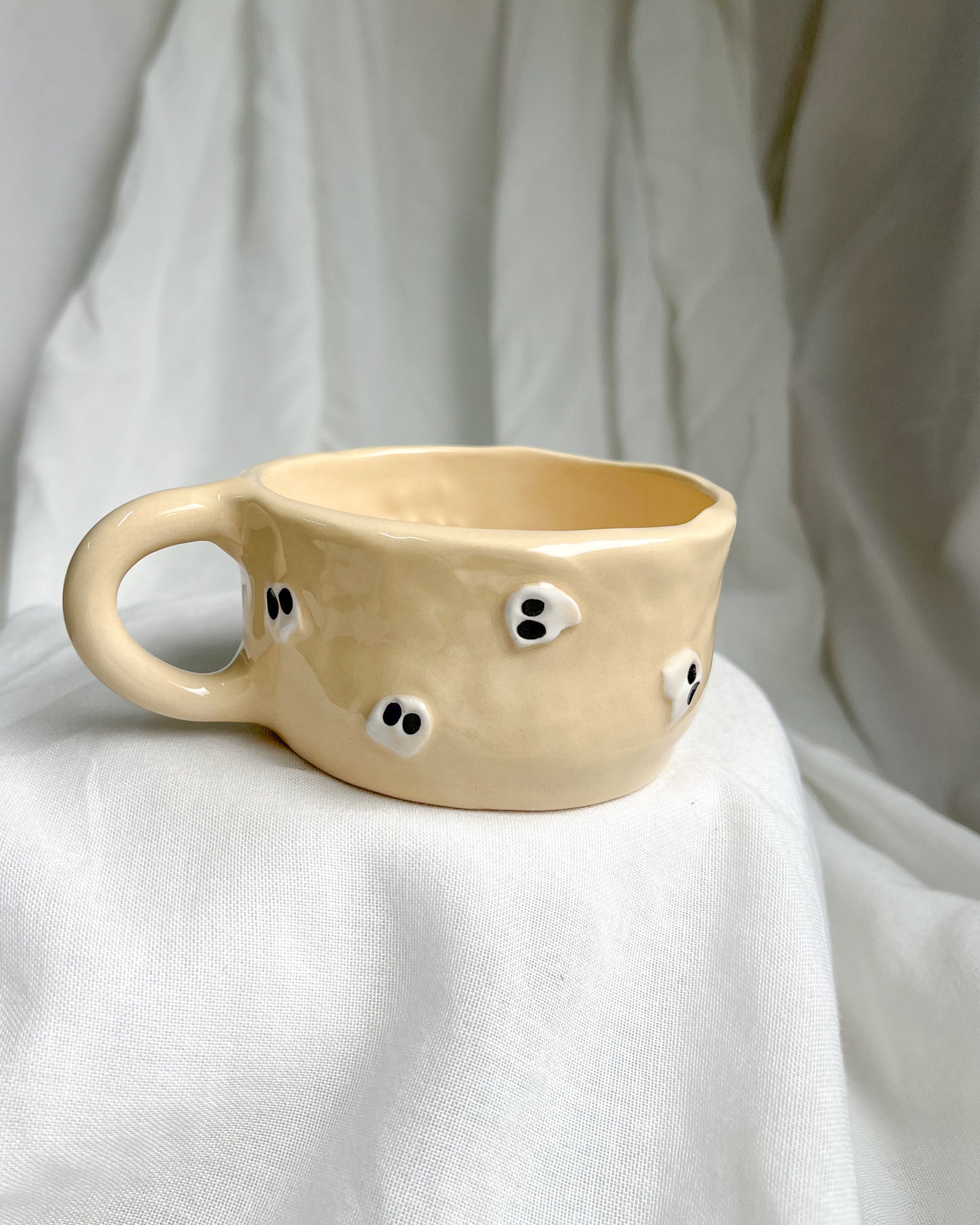Ceramic mug, handmade with a Halloween pattern. The mug has convex ghosts and the inscription on the front "too cute to spook"