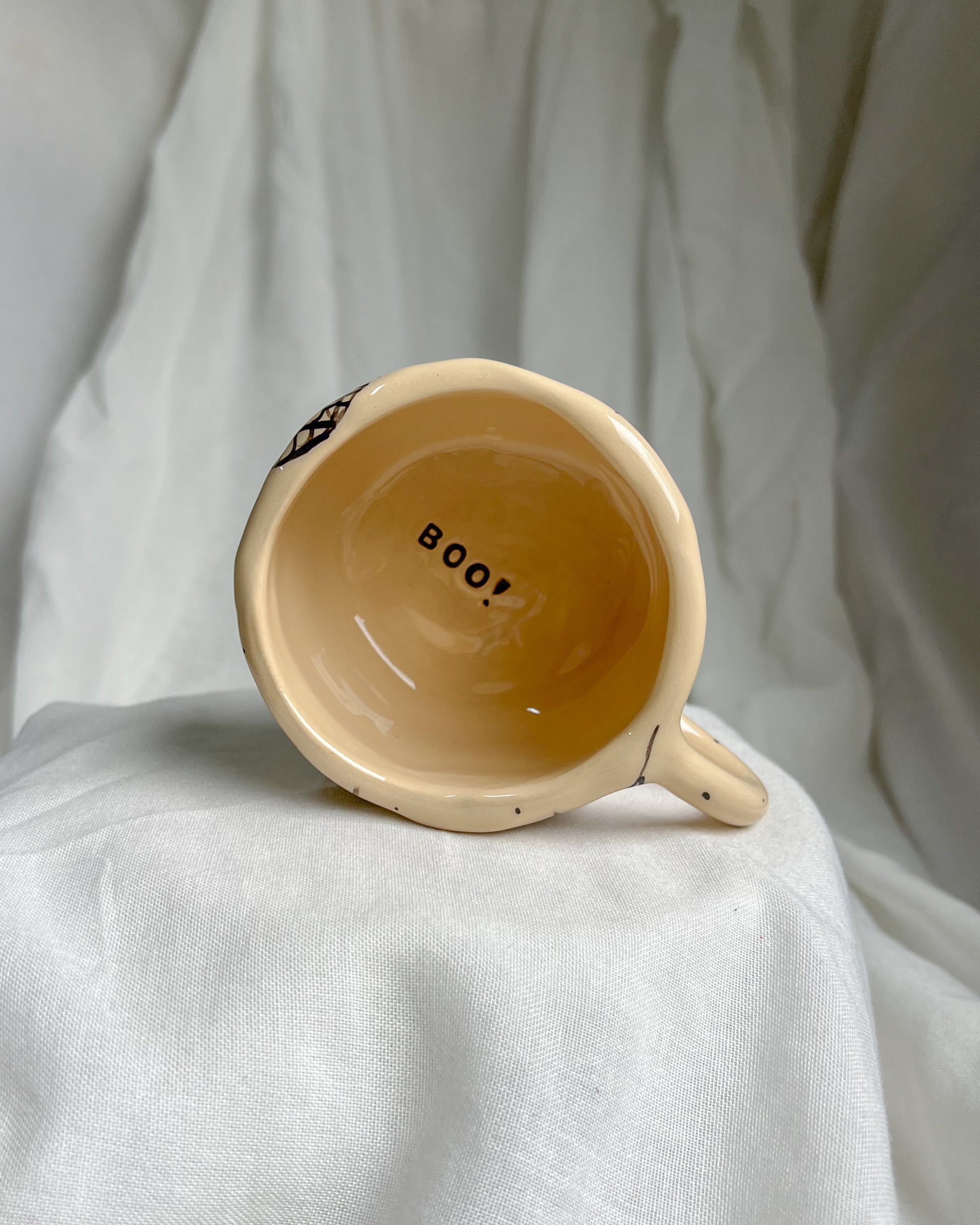 Ceramic mug, handmade with a Halloween pattern. The Mug has the inscription "BOO" on the bottom