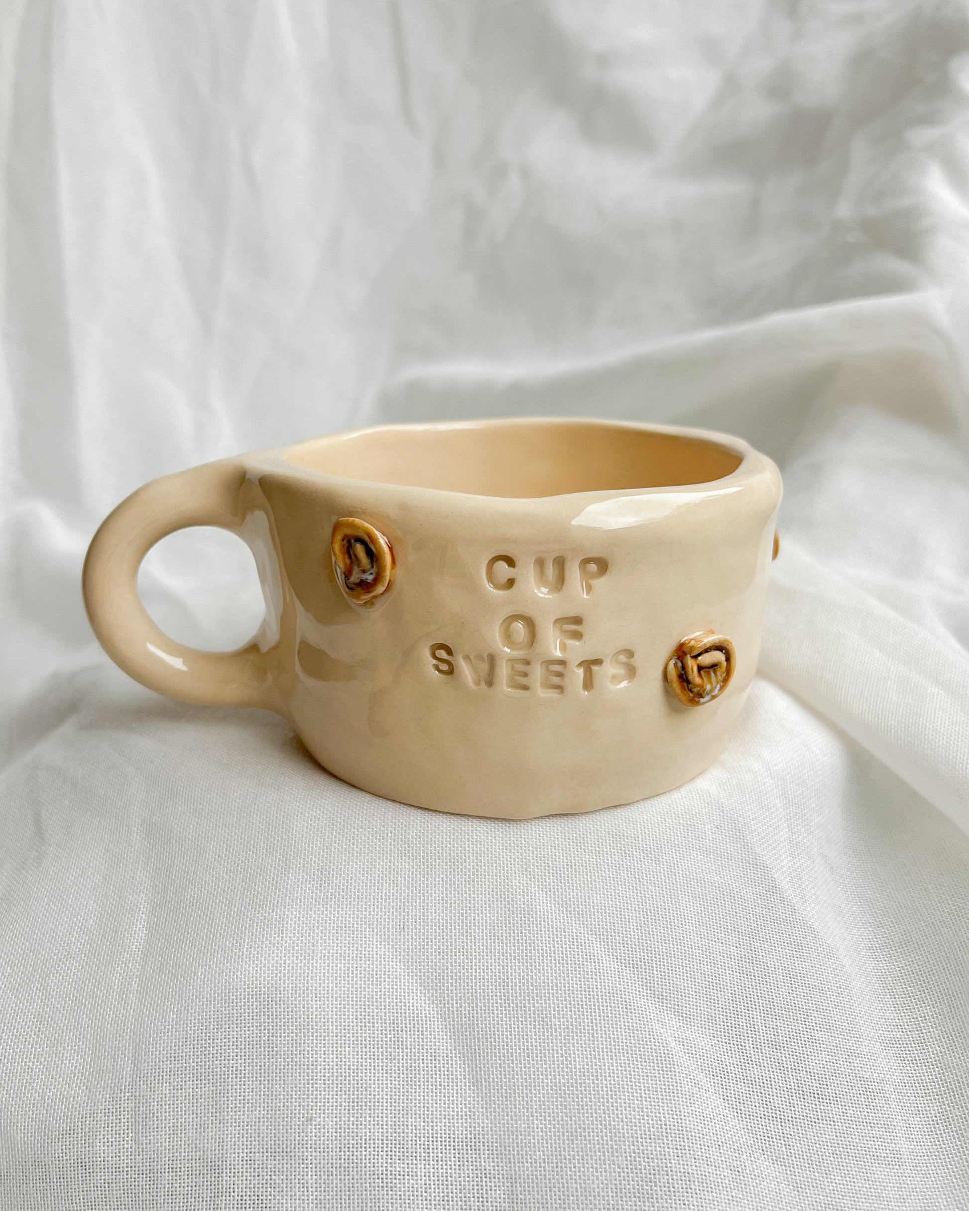 Handmade ceramic mug with cinnamon with a sentence on the front. Each mug is handmade, there may be slight differences or imperfections between the same models of mugs.