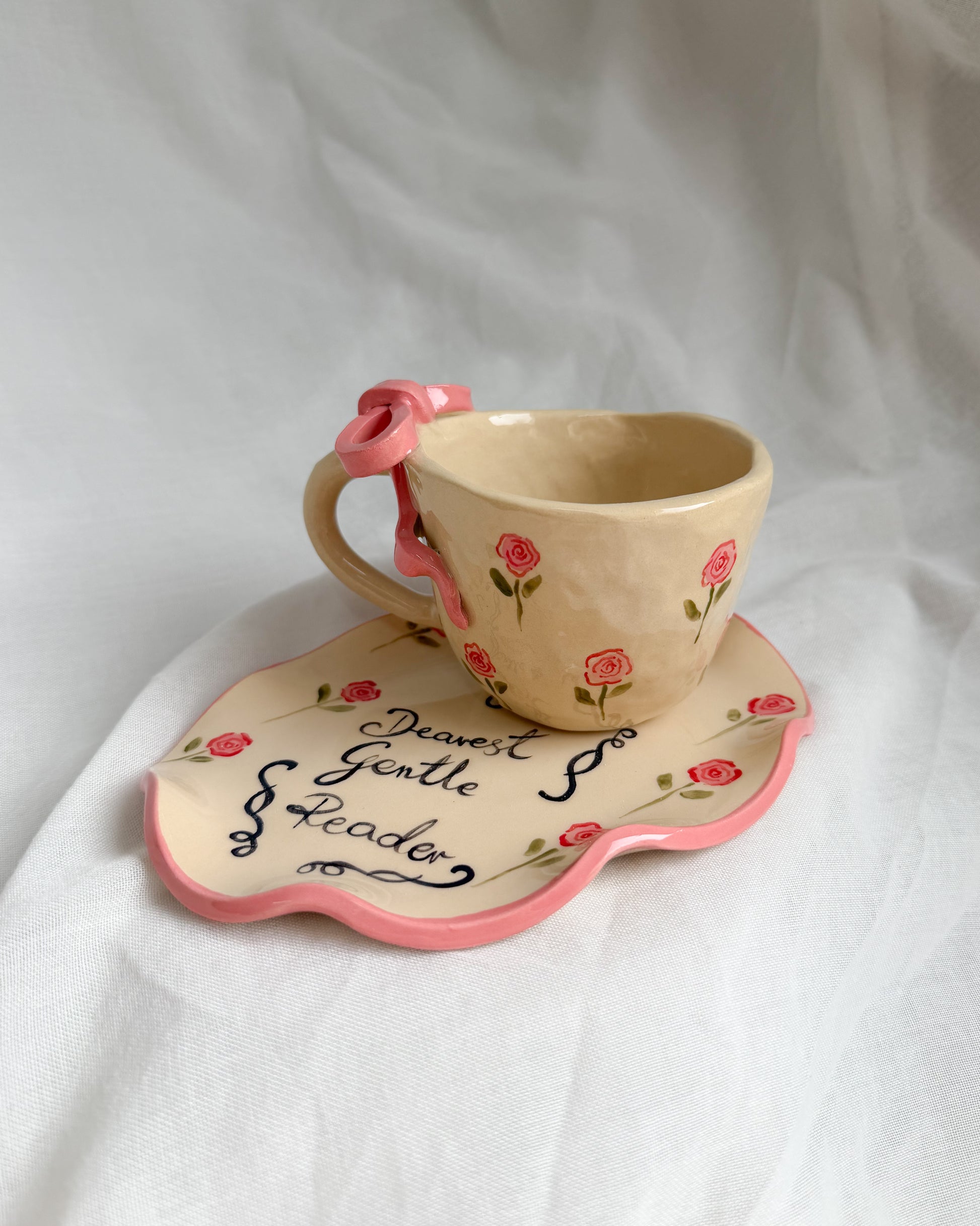 Ceramic cup with oval plate, red roses with pink ribbon. Bridgerton theme.