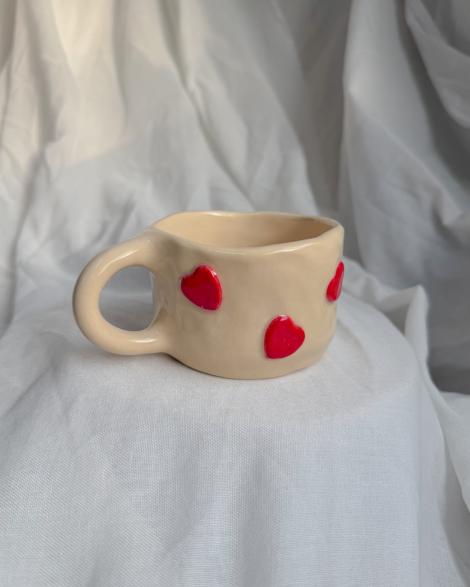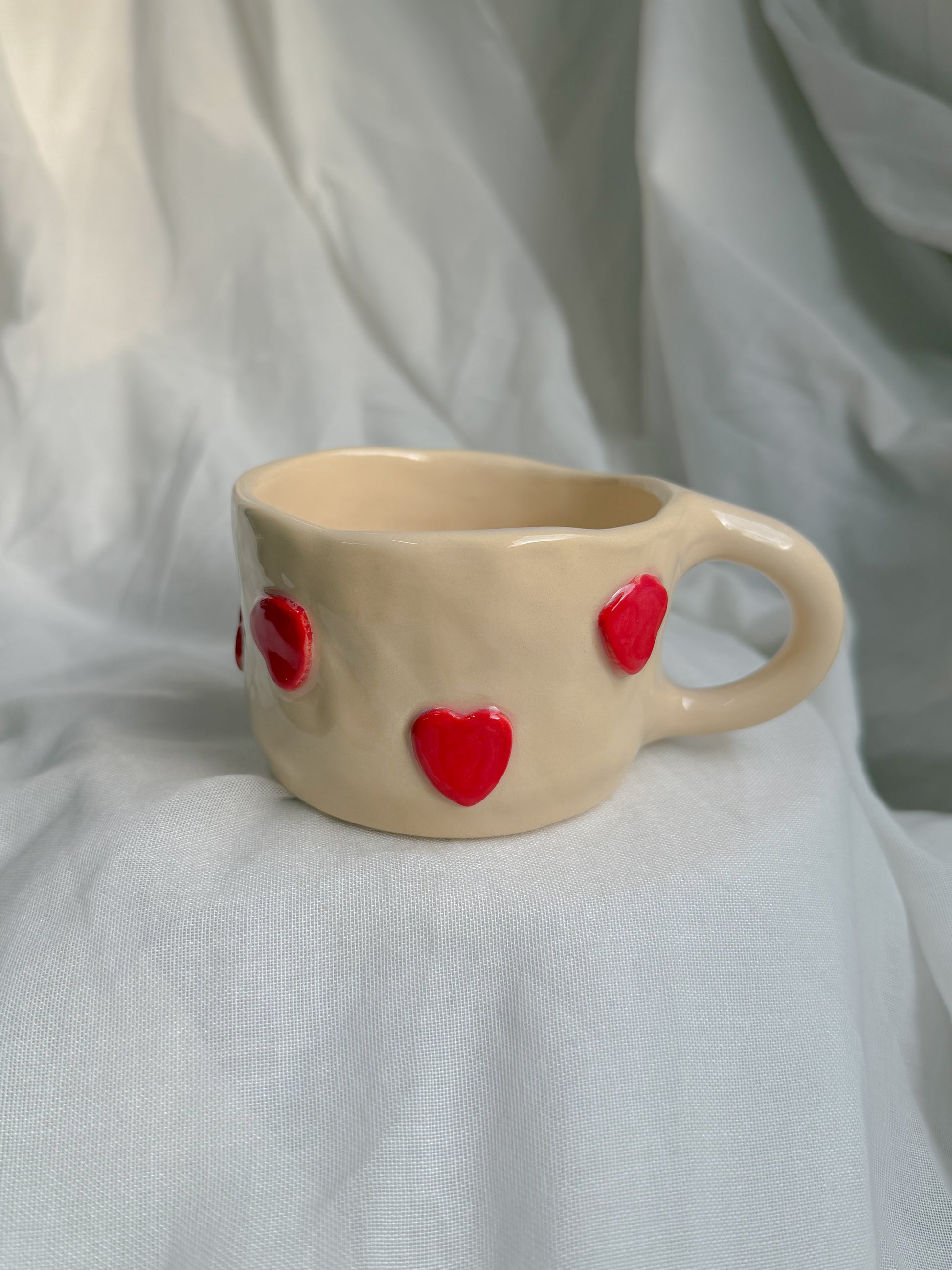 Handmade ceramic mug with convex heart pattern. Each mug is handmade, there may be slight differences or imperfections between the same models of mugs.