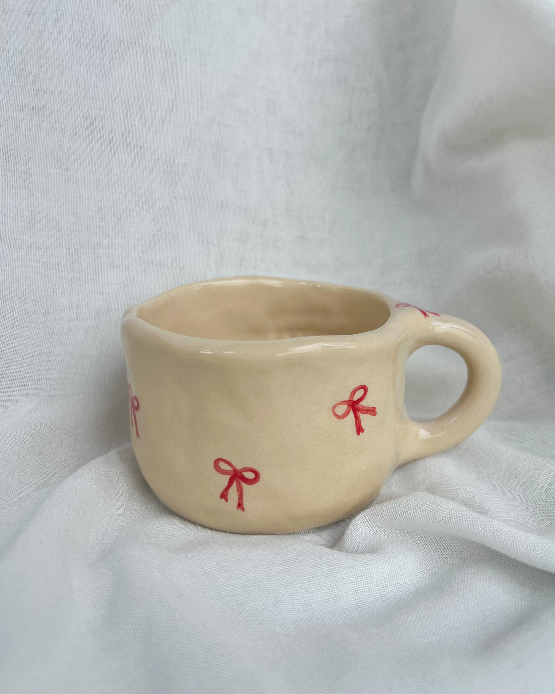 Handmade ceramic mug with bow pattern. Each mug is unique and handmade, so there may be slight differences or imperfections between the same models of mugs.