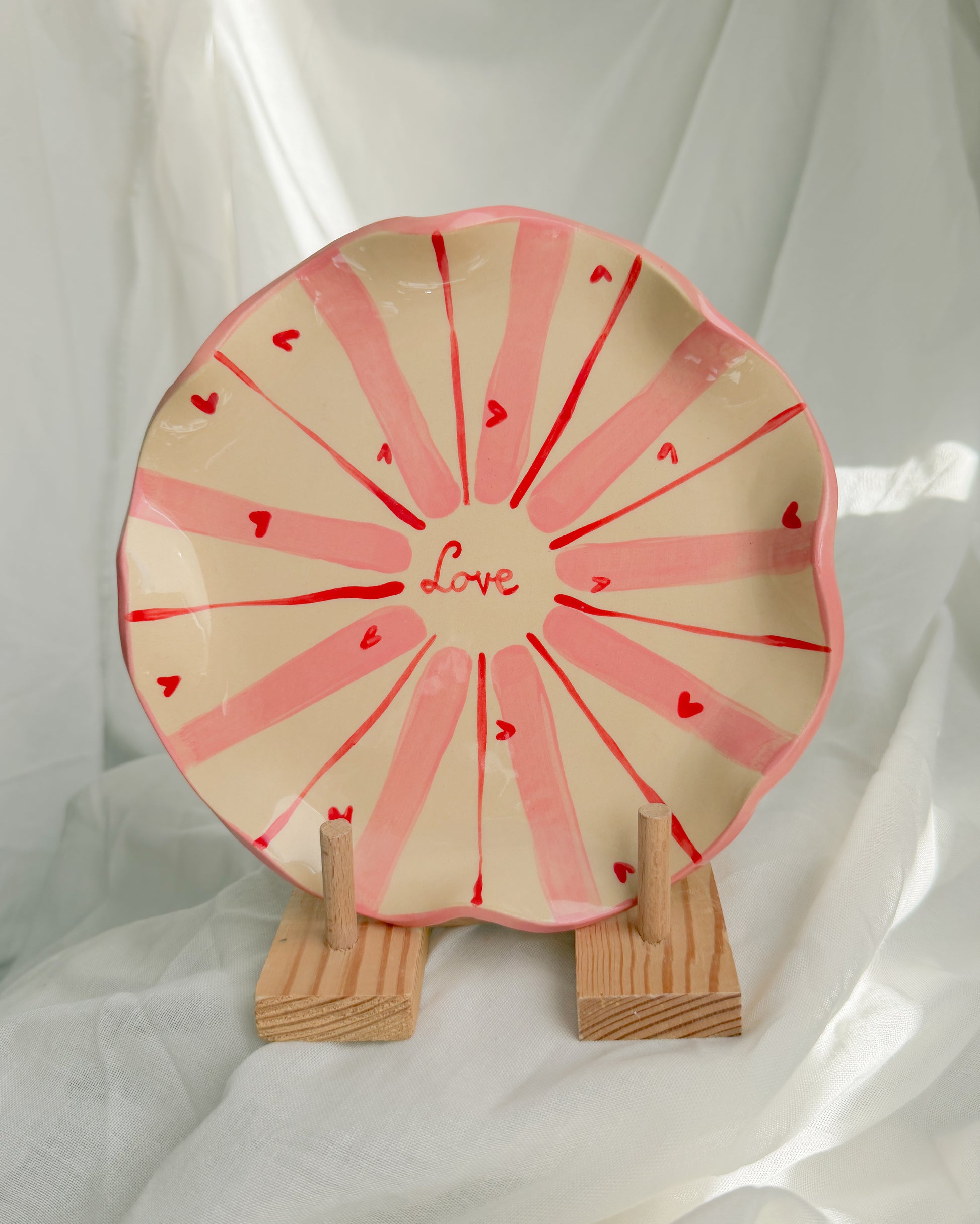 Handmade ceramic decoration plate with pink accents. Each plate is unique and handmade.