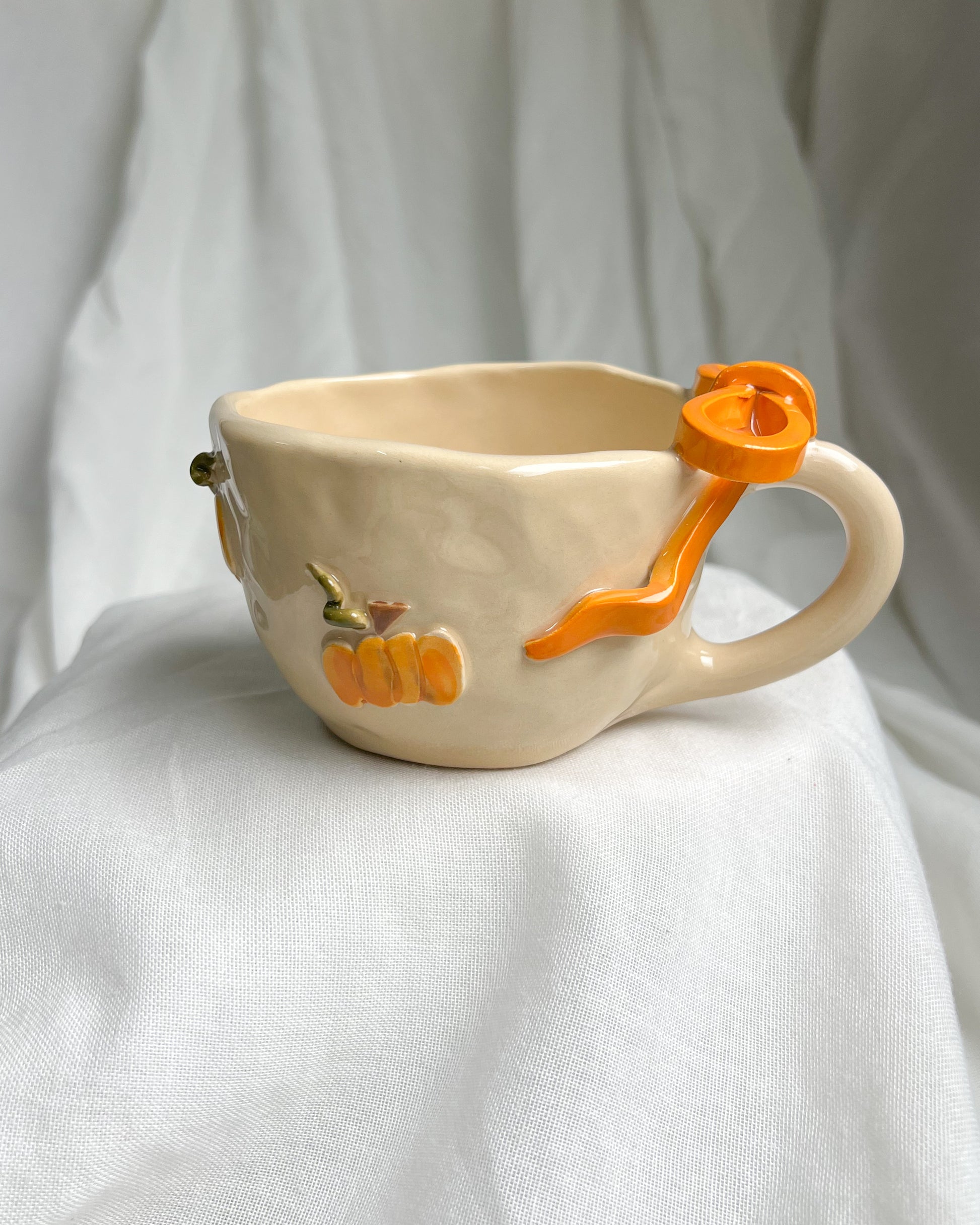 Handmade ceramic mug with ribbon and pumpkin pattern. Each mug is unique and handmade, there may be slight differences between the same models of mugs.